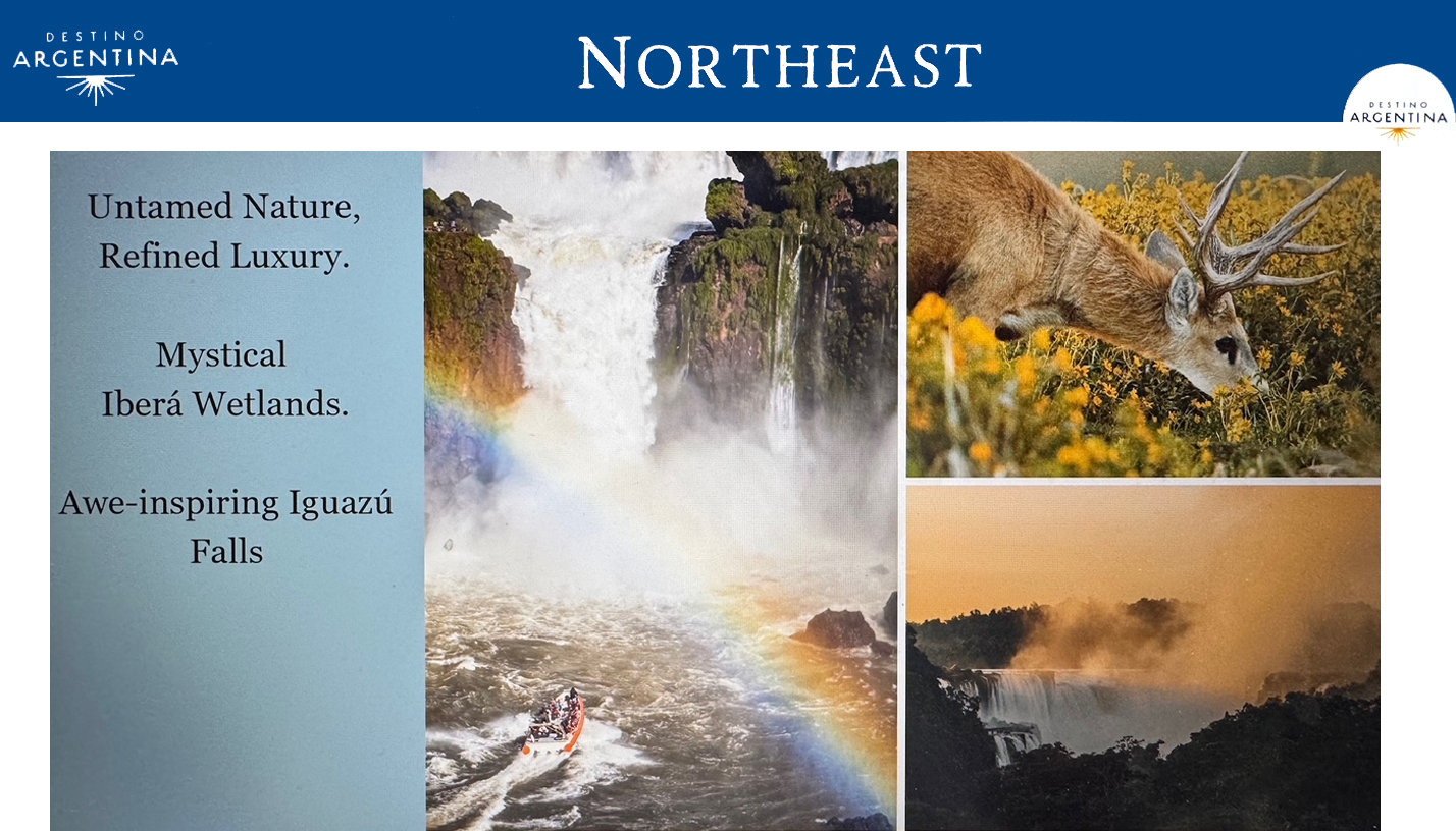 Severovýchodní Argentina láká především ikonickými vodopády Iguazú, jedním z nejúchvatnějších přírodních divů světa. K tomu přidává eko-lodže v deštném pralese, pozorování fauny a projekty komunitního turismu. Segmentově ideální pro přírodní, zážitkový a luxusní inbound.